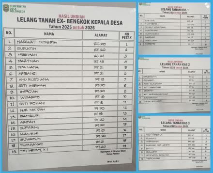 Pemerintah Desa Nglongsor mengucapkan selamat kepada masyarakat yang telah memenangkan undian pelelangan tanah kas desa untuk kegiatan pertanian. Kegiatan ini merupakan bagian dari upaya pemerintah desa dalam mengoptimalkan pemanfaatan aset desa untuk meningkatkan kesejahteraan masyarakat serta mendukung ketahanan pangan di tingkat desa.