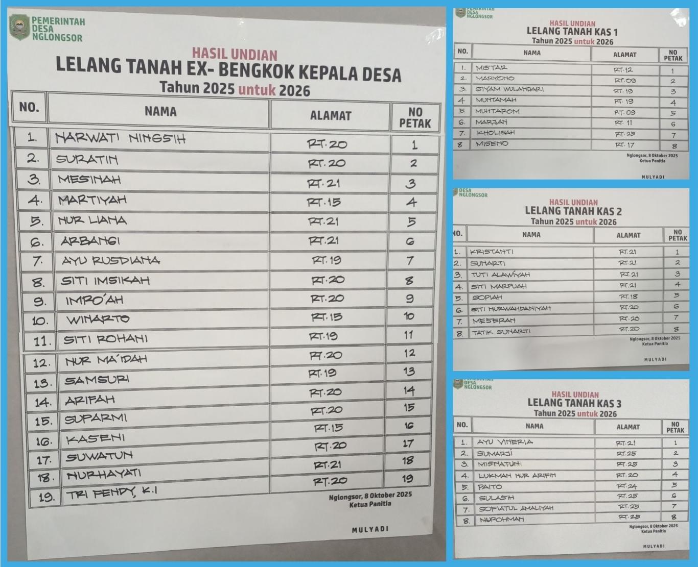 Panitia Lelang Tanah Kas Desa Nglongsor Tahun 2025 telah melaksanakan Pelelangan Tanah Kas Desa Nglongsor untuk masa tanam November 2025 sampai dengan Oktober 2026, adapun pelelangan yang dilaksanakan adalah sebagai berikut:
