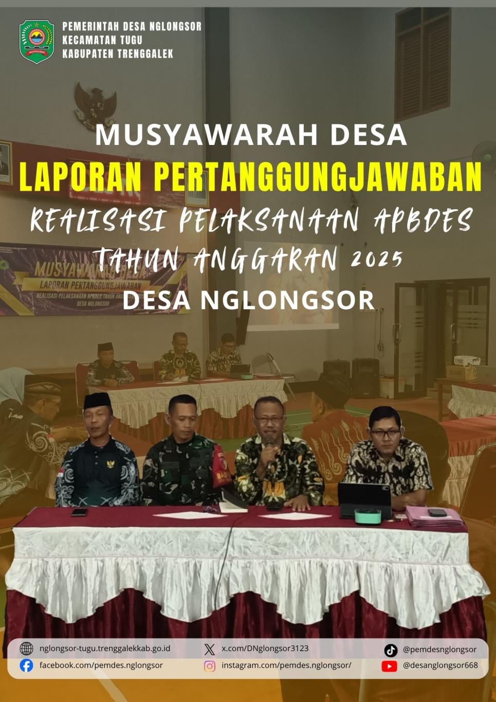 Pemerintah Desa Nglongsor telah melaksanakan kegiatan Musyawarah Desa Laporan Pertanggungjawaban Realisasi Pelaksanaan APBDes Tahun Anggaran 2025 pada hari Senin, tanggal 26 Januari 2026. Kegiatan ini diselenggarakan di Aula Kantor Desa Nglongsor sebagai bentuk transparansi dan akuntabilitas pemerintah desa kepada masyarakat.